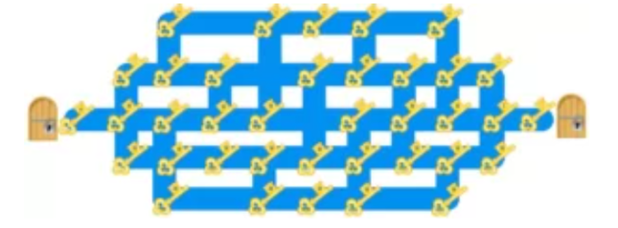 Нужно пройти по лабиринту от левой двери до правой, при это ни на каком участке пути нельзя побывать дважды (в том числе нельзя дважды проходить один и тот же «перекресток»).